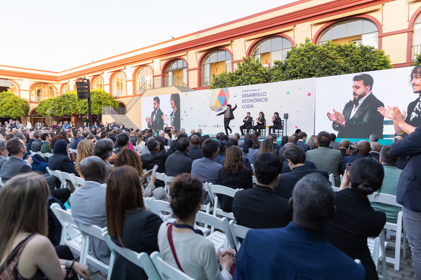 Al finalizar la jornada, se llevó a cabo la inauguración oficial del VI Foro Mundial de Desarrollo Económico Local en la sede de la Diputación de Sevilla. El acto contó con la participación de destacadas autoridades, entre ellas María Jesús Montero Cuadrado, vicepresidenta primera y ministra de Hacienda del Gobierno de España; Antonio Sanz, consejero de la Presidencia, Interior, Diálogo Social y Simplificación Administrativa de la Junta de Andalucía; Francisco Reyes, presidente del Fondo Andaluz de Municipios para la Solidaridad Internacional (FAMSI); Francisco Javier Fernández de los Ríos Torres, presidente de la Diputación de Sevilla; y Jan Van Zanen, presidente de Ciudades y Gobiernos Locales Unidos (CGLU) y alcalde de La Haya, José Luis García Martín, vicepresidente de FAMSI y octavo teniente de alcalde responsable del Área de Barrios de Atención Preferente. Durante sus intervenciones, resaltaron la importancia del foro como plataforma para promover el desarrollo económico local sostenible y fortalecer la cooperación entre territorios a nivel global.